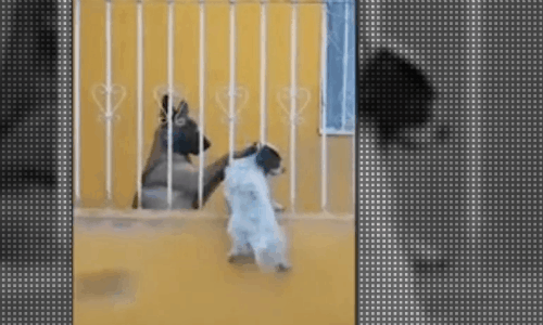 Despite being separated by a very tall wall, these two neighborly dogs were forming an unlikely friendship. The dogs then appeared to jump up onto the fence to hug each other and greet one another. Scaling the fence was no easy task for either dog, but they seemed up for the challenge to build their friendship.